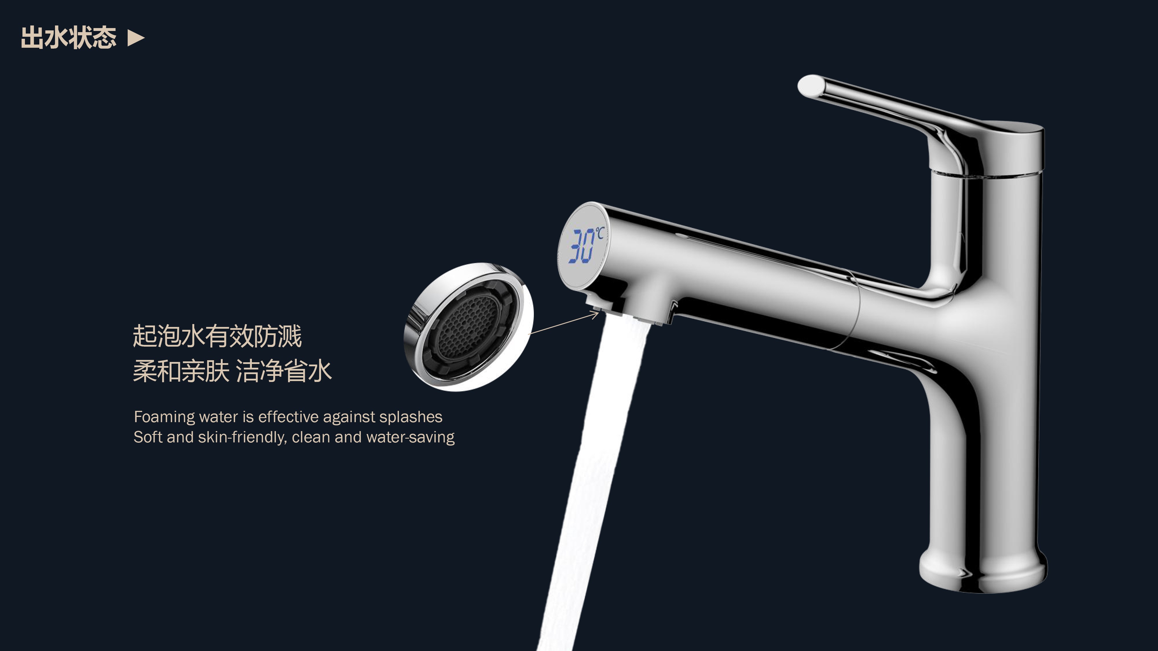 出水溫度實(shí)時(shí)看得見,解鎖龍頭舒適用法;抽拉范圍廣,360°全方位清洗;日常洗頭利器,龍頭抽拉出水輕松洗;氣泡水有效防濺,柔和親膚,潔凈省水;重力錘復(fù)位系統(tǒng),順暢伸縮,精準(zhǔn)回位