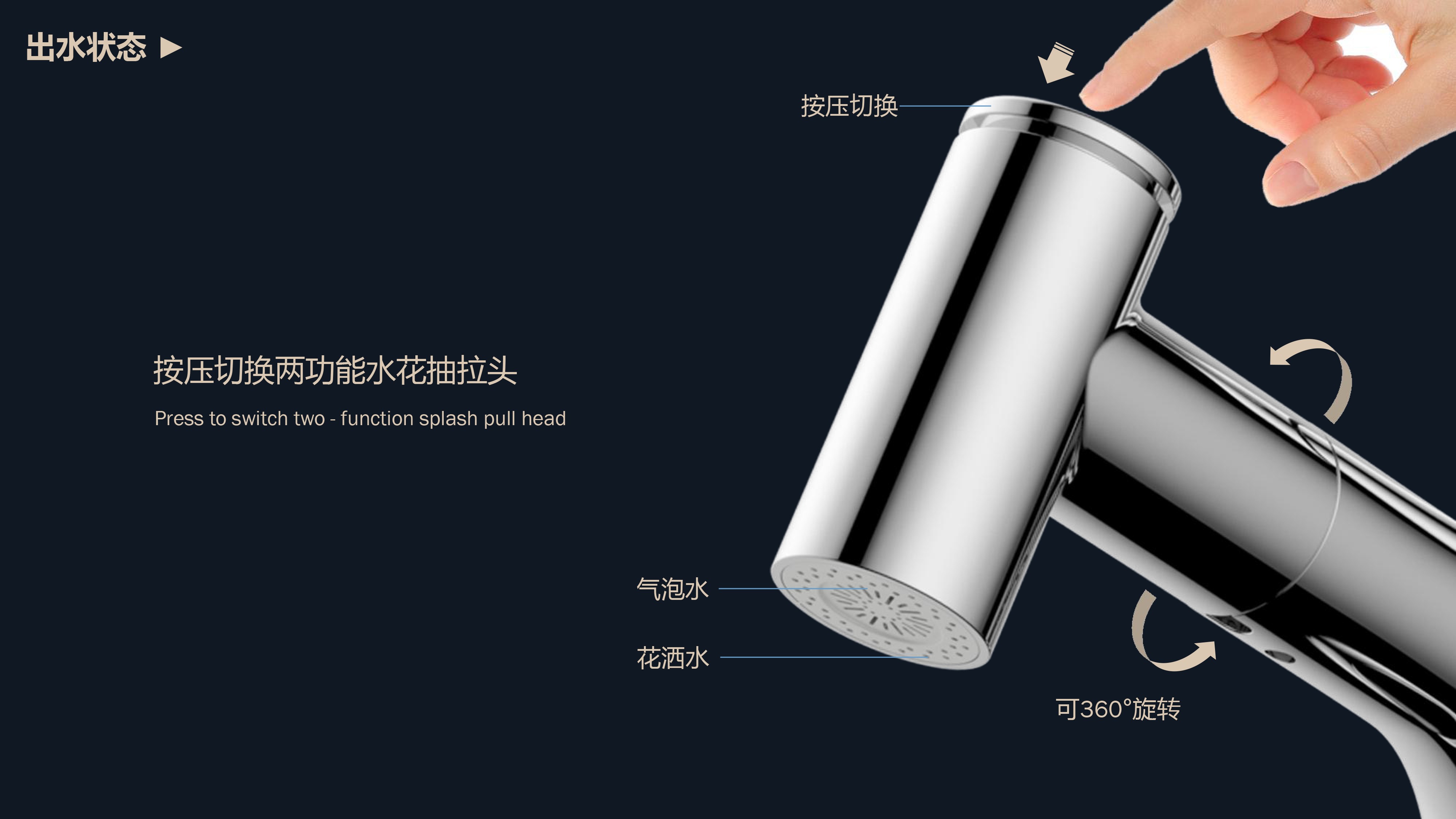 360°全方位抽拉清洗;微光龍頭,深夜使用不開大燈,不刺眼;日常洗頭利器,抽拉出水輕松洗;按壓切換兩功能水花;三種顏色LED燈光顯示水溫;重力錘復(fù)位設(shè)計(jì),順暢伸縮,精準(zhǔn)回位;無(wú)需工具,一推一擰10秒快裝